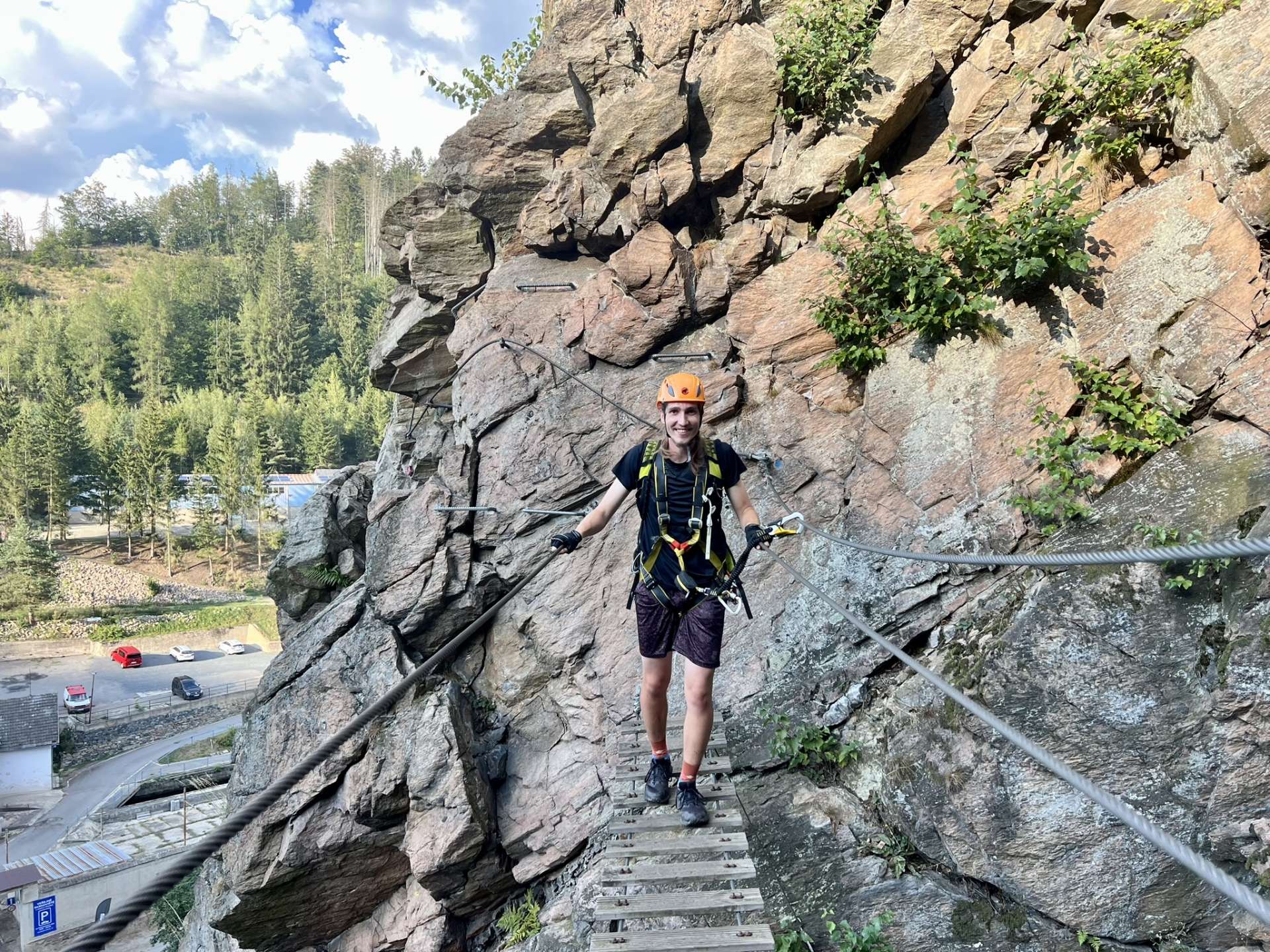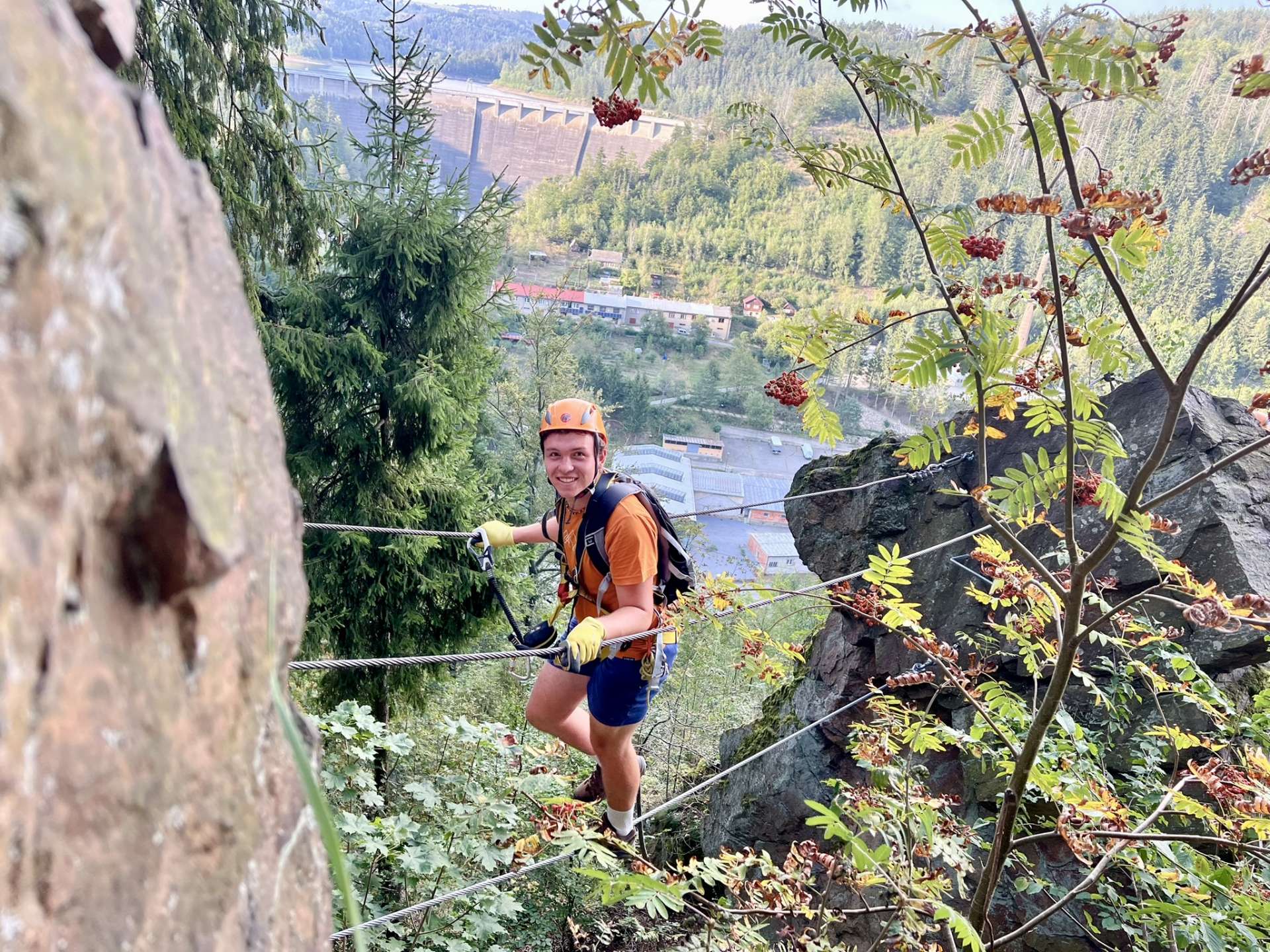 In August 2024 an exciting via ferrata event took place at Vír, organized by the NGO Four Links. The day was split into two time slots engaging two groups of participants. The event leader, Aneta, welcomed both groups and provided an introduction to via ferratas, including a briefing on safety procedures, the history of ferratas, the international ranking system, and the importance of understanding route markings. She also took time to highlight the organising NGO – Four Links, its involvement within e29 network and shared information about past and upcoming projects.